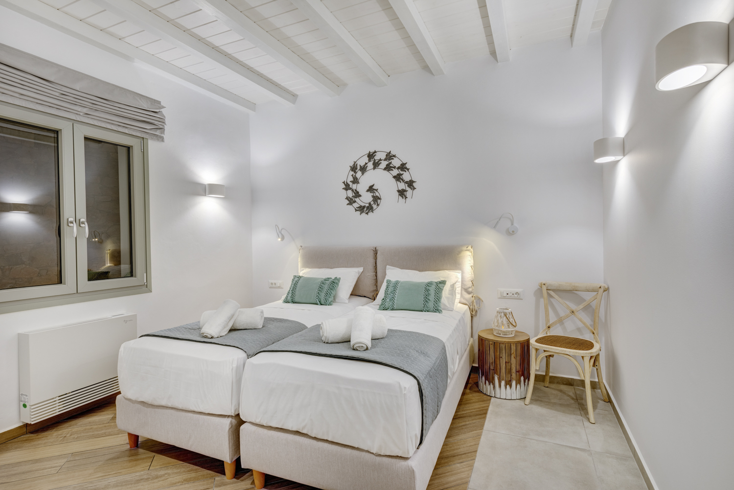 Aelion Sea provides two bedrooms, one with queen sized bed and one with two single sized beds. It is capable of hosting four people.